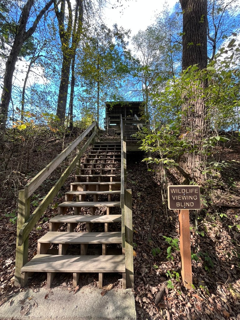 About a third of the way through, you’ll find a wildlife viewing blind overlooking a small pond. We didn’t spot anything too exciting during our visit, but the blind displays photos of wildlife that frequent the area—deer, turtles, colorful birds, and the occasional muskrat. (I’m fine skipping that one!)