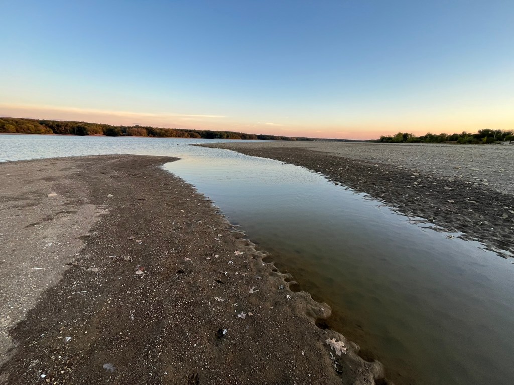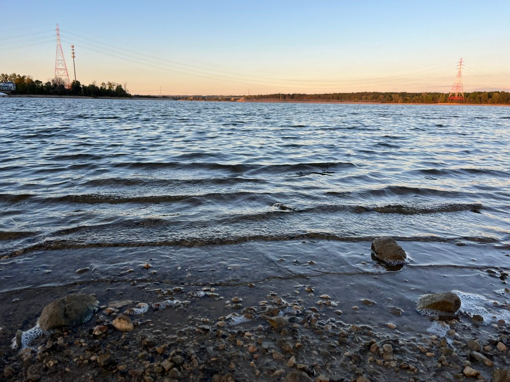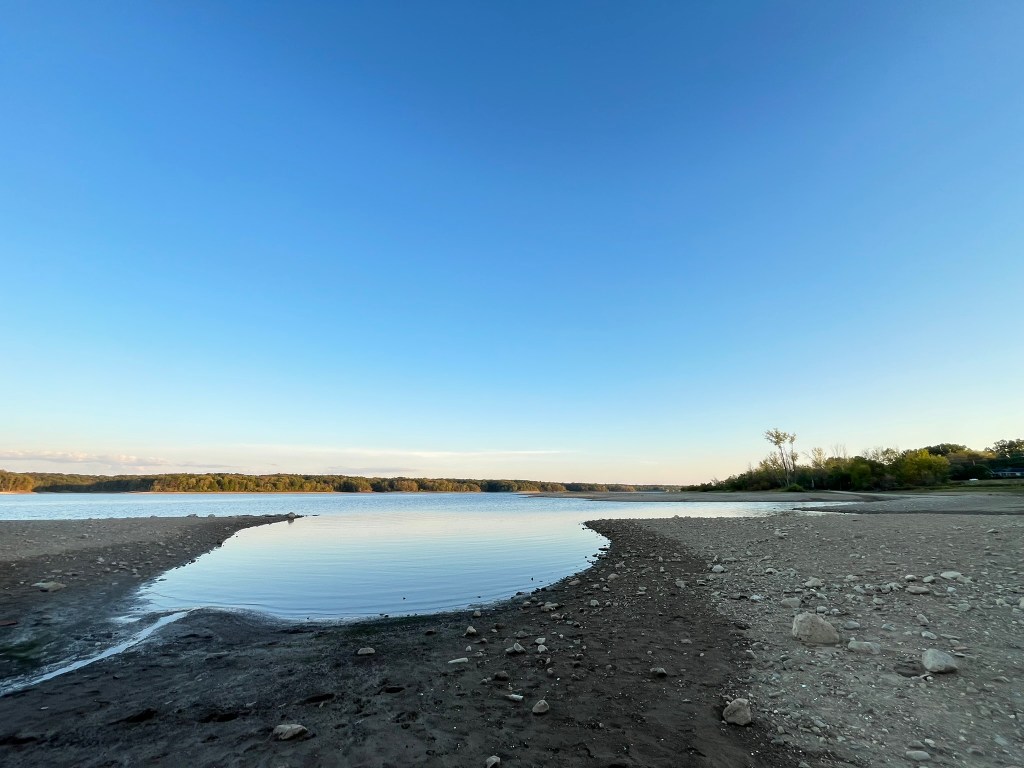 As we drove, something unusual caught our eye — the water level was shockingly low. Normally, the reservoir stretches right up to the parking area and bike path, but because of a recent drought, the water had receded dramatically. A large portion of the lakebed that’s usually underwater was now completely dry and walkable.