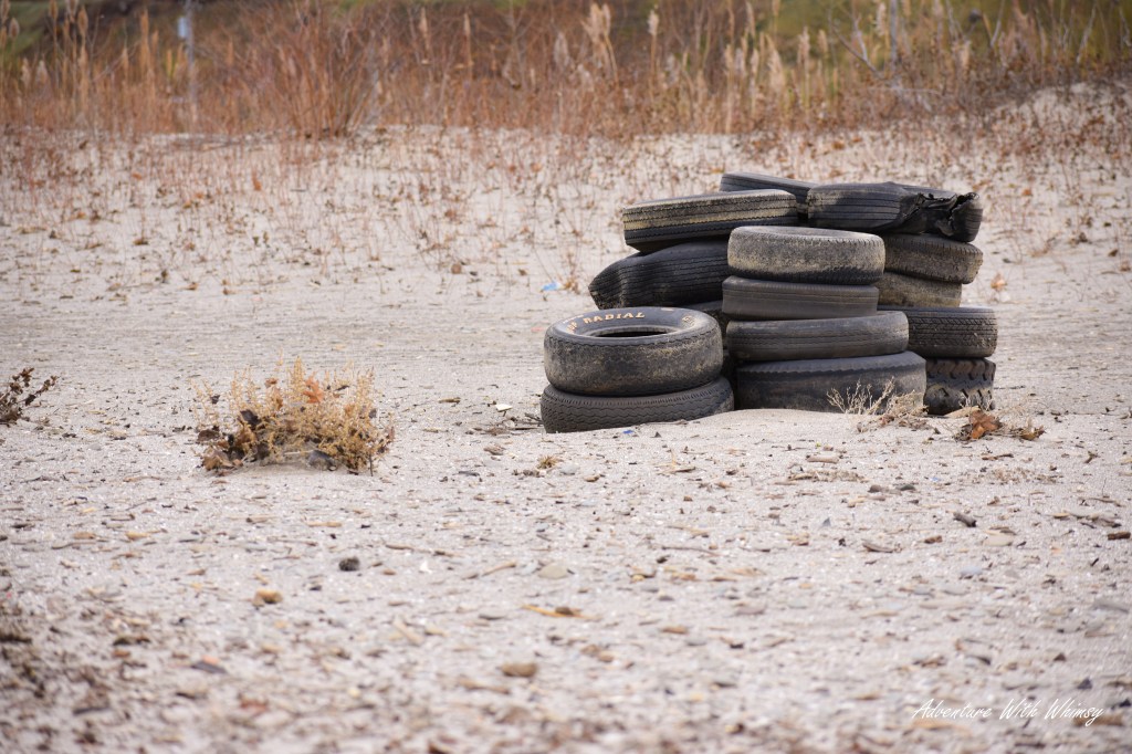 Because of Ohio’s ongoing drought, parts of the beach had dried up more than usual, revealing extra shoreline—and, strangely, what can only be described as a tire graveyard. Dozens upon dozens of tires half-buried in sand and mud. Why they were there, I’ll never know, but they made for an unexpected discovery.