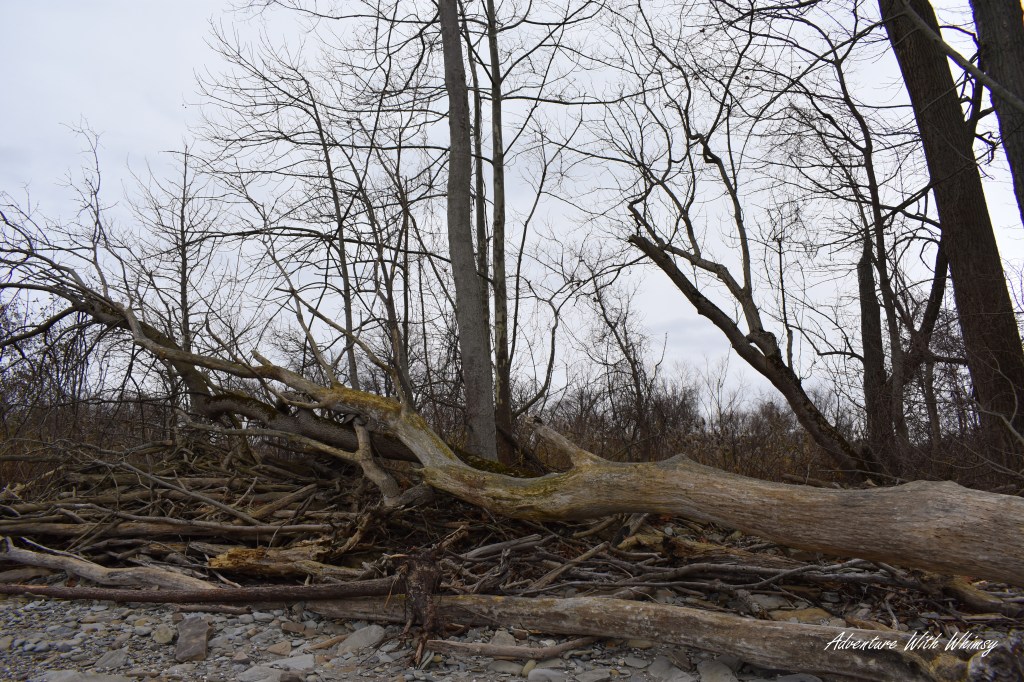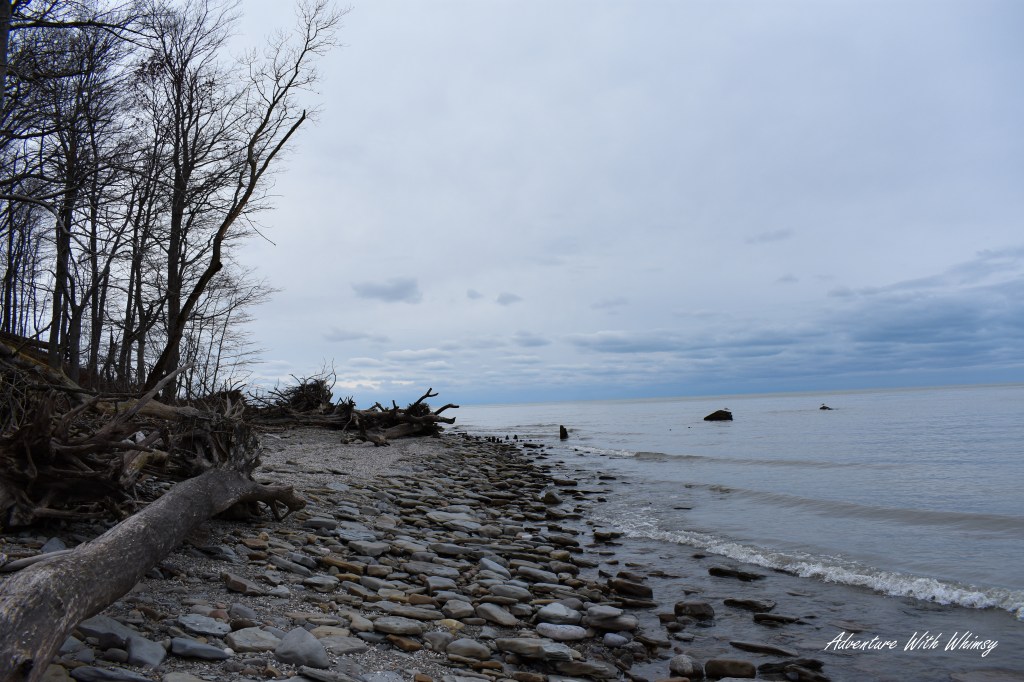 So, with a mutual shrug and some suppressed common sense, we continued. We reached the bluffs, climbed down, and were instantly rewarded with a dramatic scene of washed-up trees, crashing waves, and a rocky shoreline. Under different circumstances, it would have been the perfect peaceful moment.