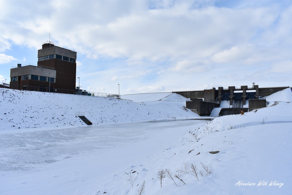It would be an epic sledding hill… but also a terrifying one. Aside from those tracks, the dam was blanketed in pristine, untouched snow—except for a narrow trail winding its way up along the creek toward the top.