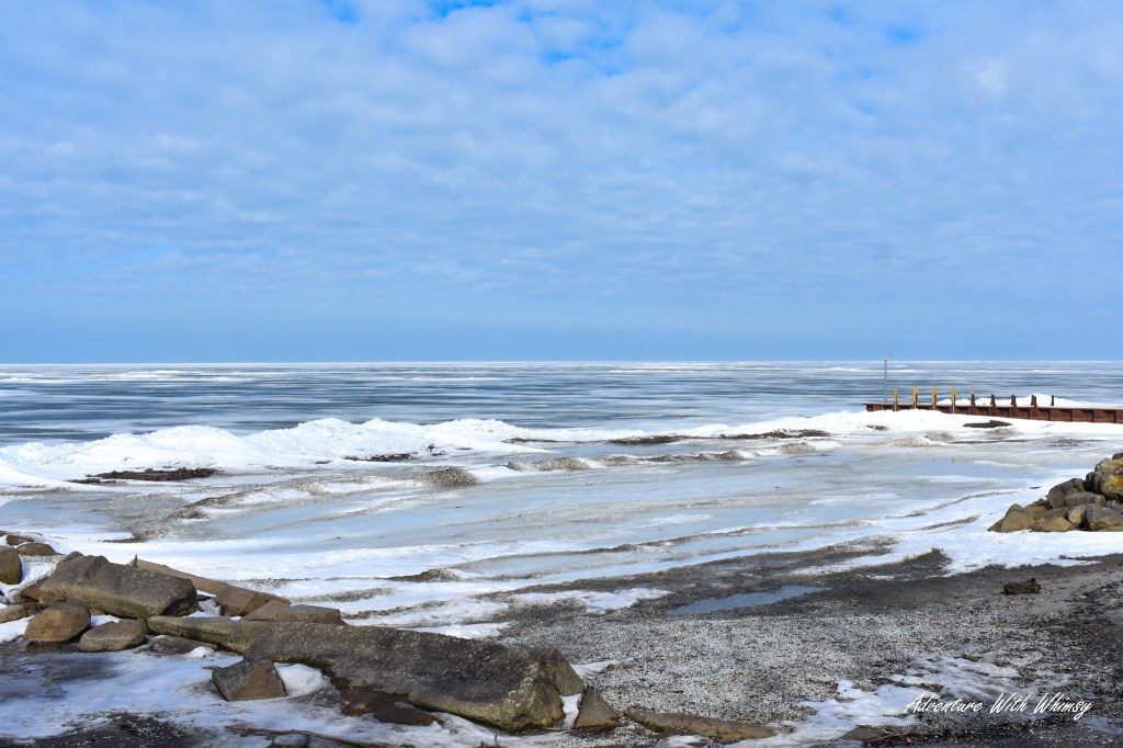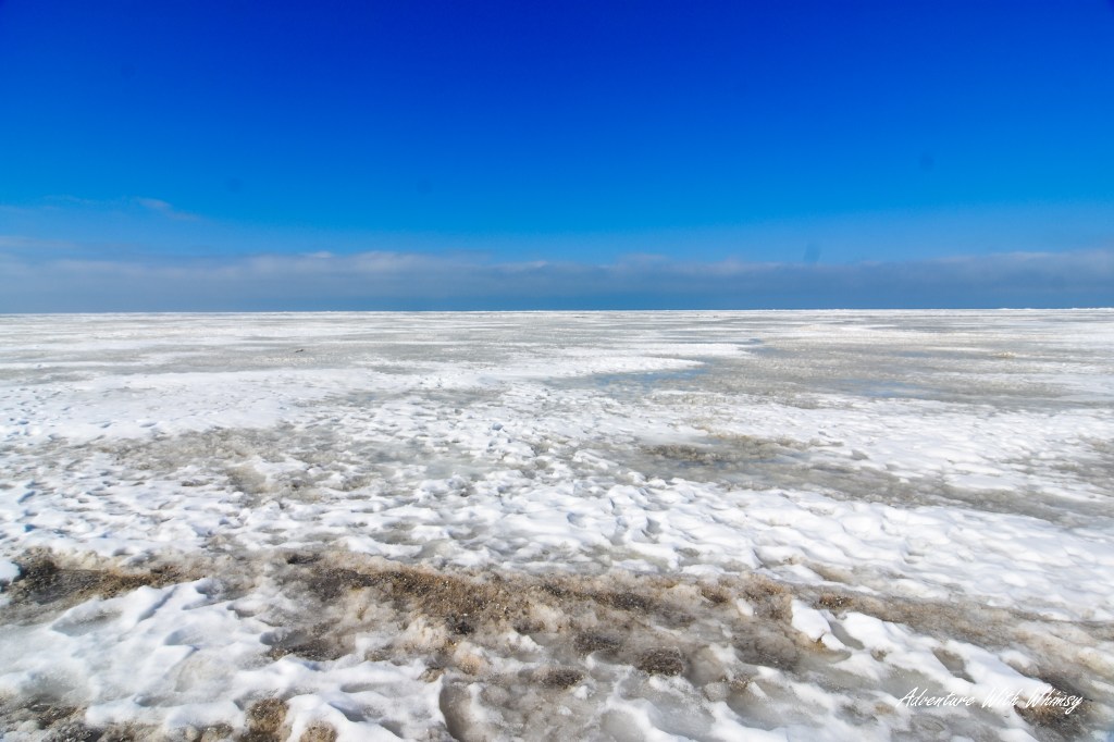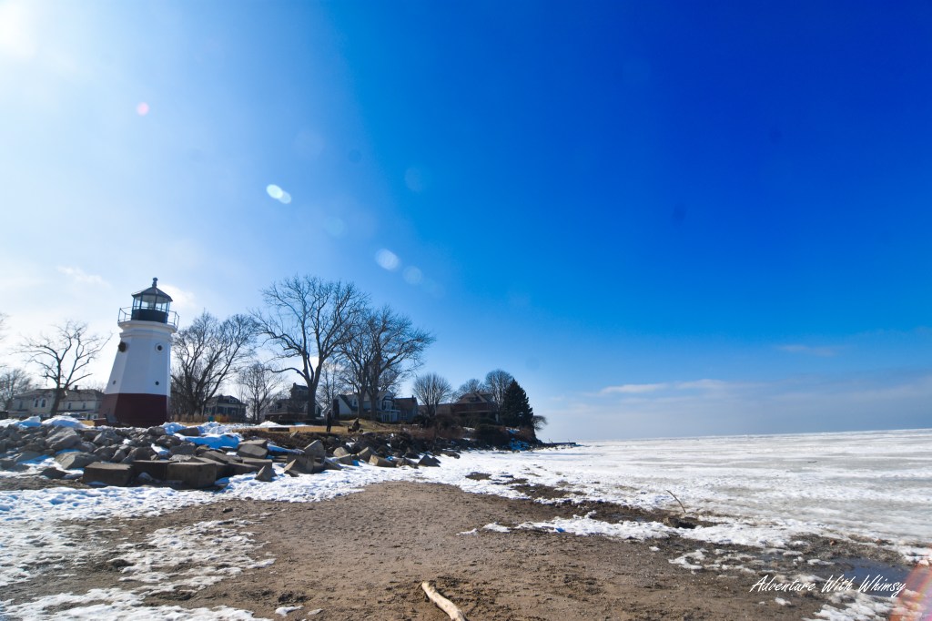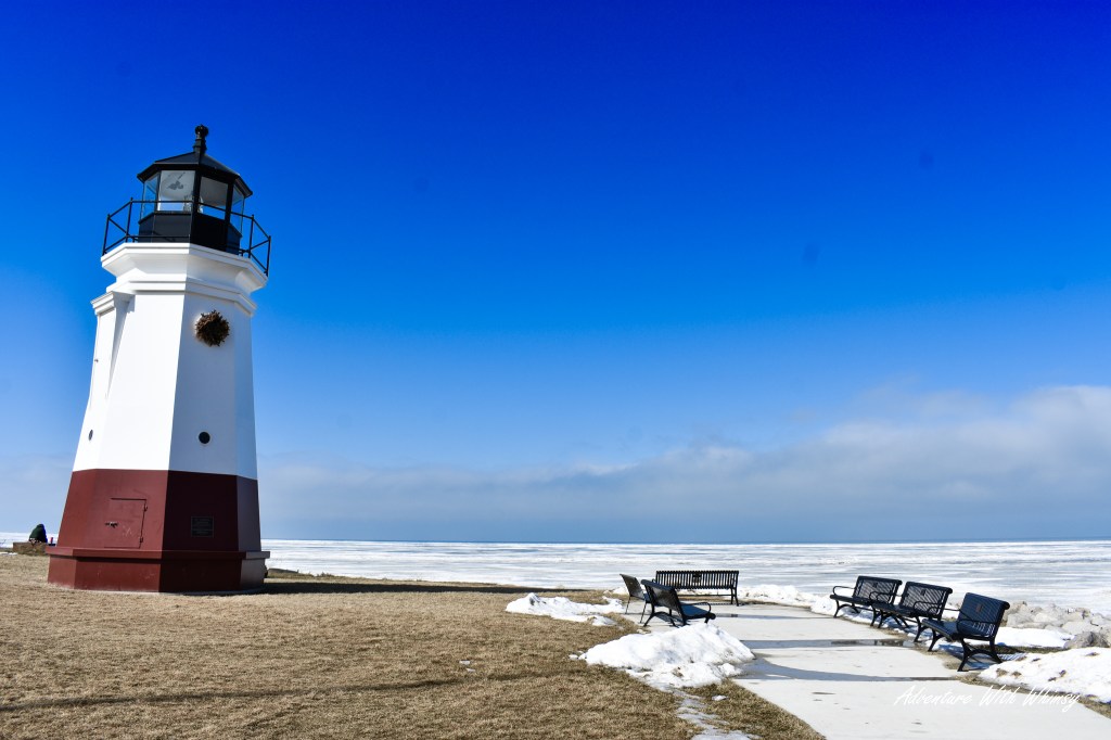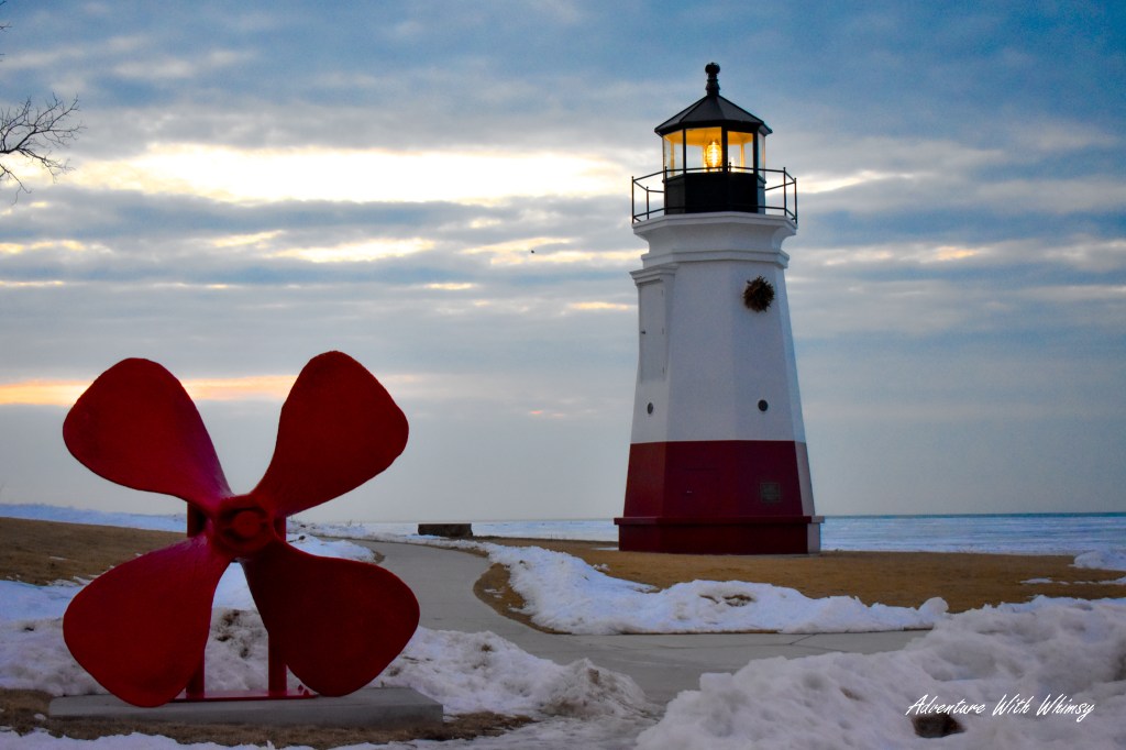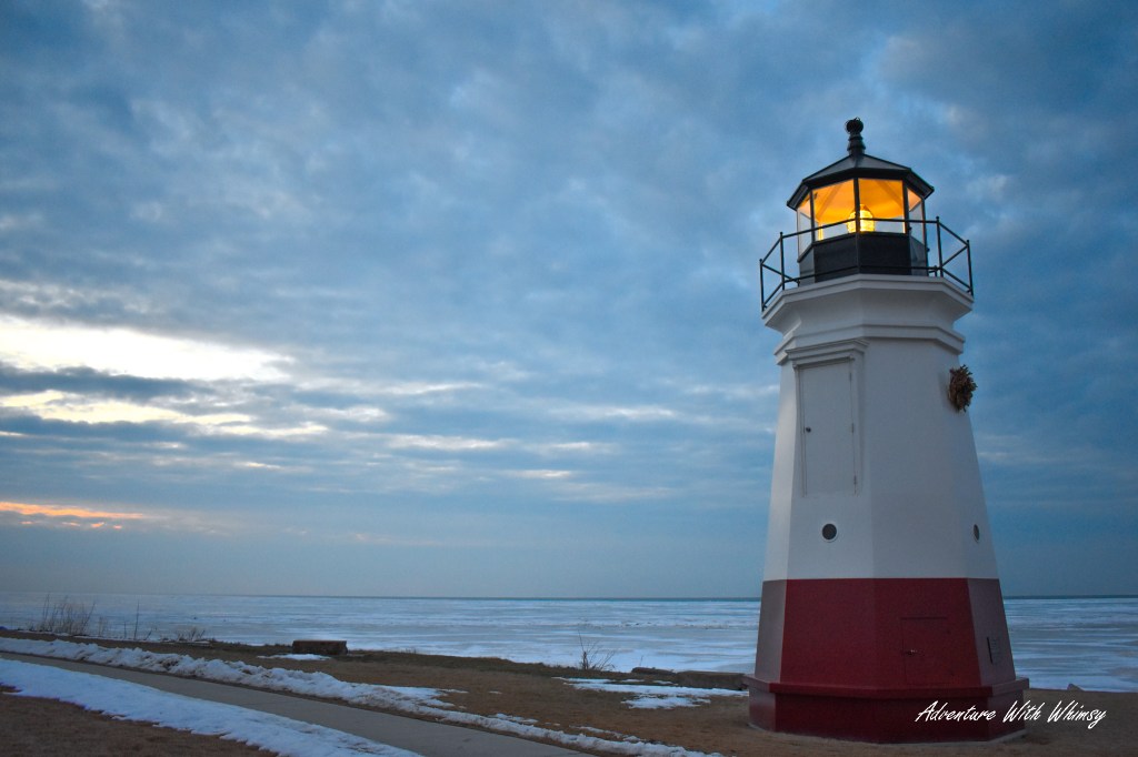 As darkness settled in and the sky shifted to deep blue, the yellow beam from the Vermilion lighthouse swept across the frozen expanse below. Standing there under the fading light, stepping carefully across the ice, felt surreal—equal parts peaceful and awe-inspiring.