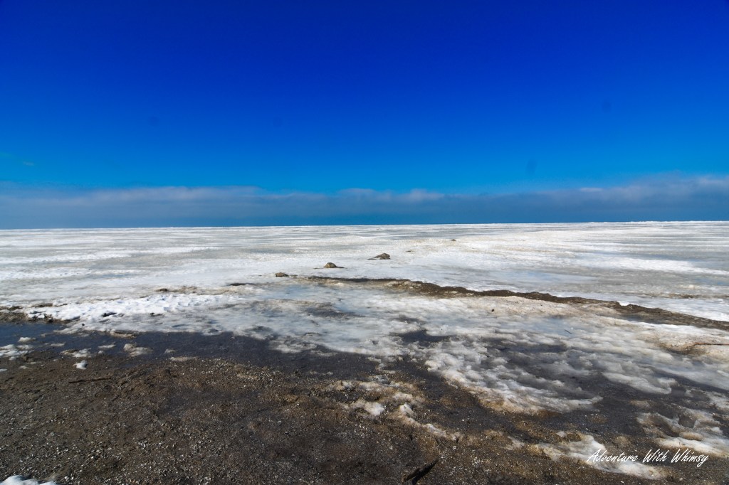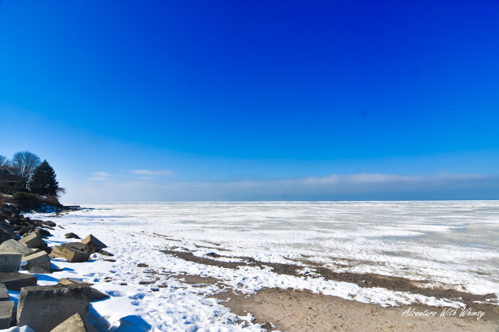 The main street beach sits just a short walk from the square, and just like at Edgewater, Lake Erie was completely frozen over. We arrived at twilight, the sun slipping below the horizon, casting a fiery orange glow across the ice and snow.
